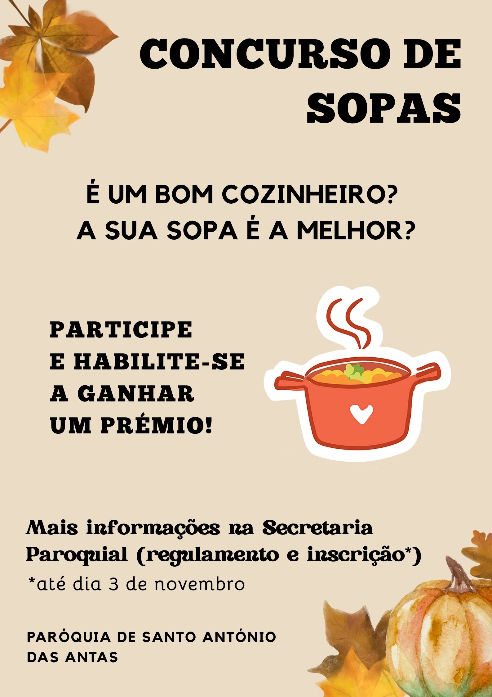 No âmbito da dinamização da comunidade paroquial de Santo António das Antas, o Grupo de Animação e Festa convida todos os paroquianos e amigos a participar no 1o Concurso de Sopas, que se realizará no dia 15 de novembro de 2025, com a intenção de promover um serão diferente, de convívio e partilha entre todos os que se queiram juntar a nós.
